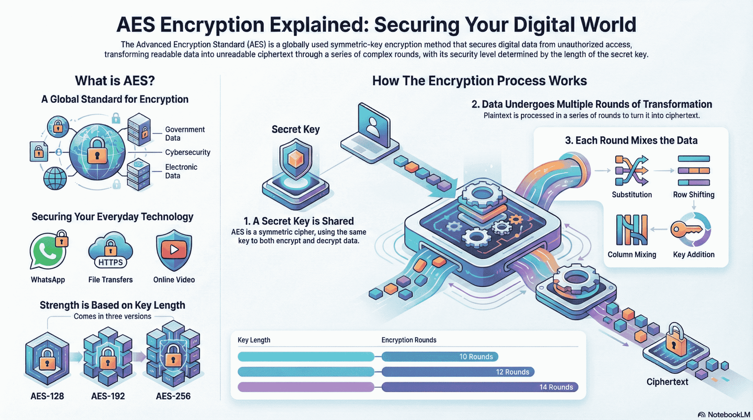 Once your data is neatly arranged, AES starts scrambling it using a series of connected steps called operations. The goal is straightforward: turn readable data (plaintext) into unreadable data (ciphertext) using a secret key.