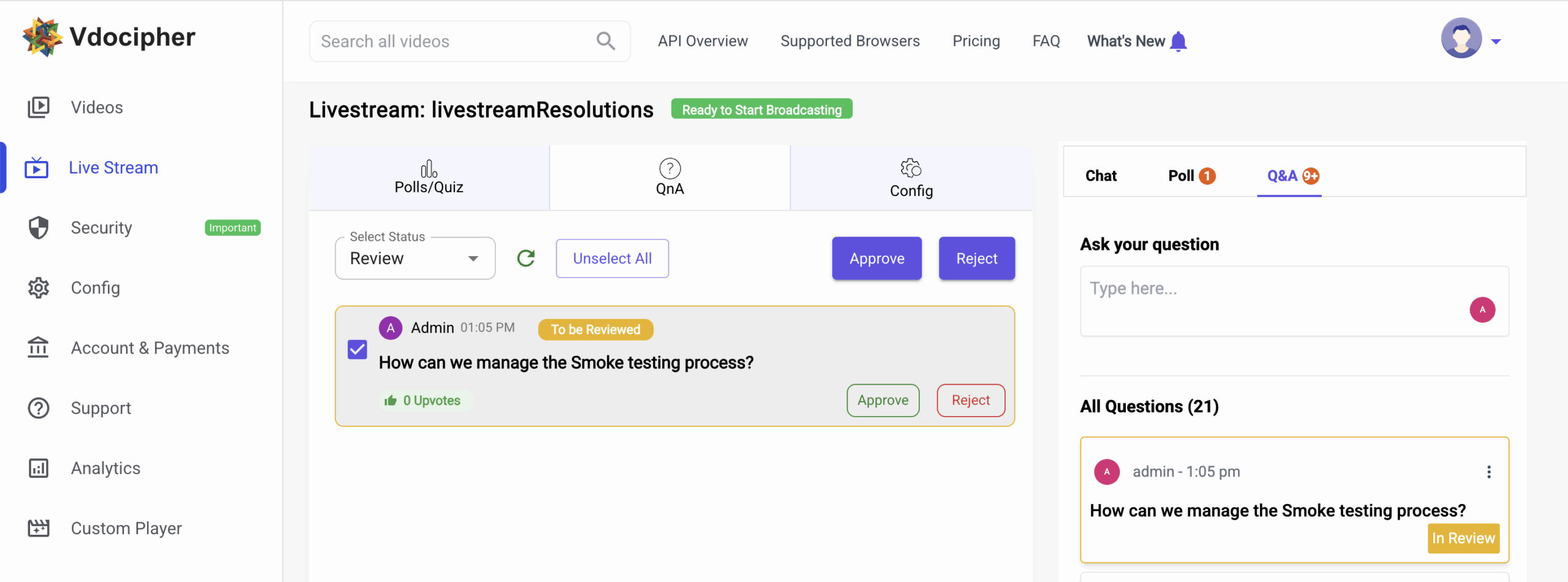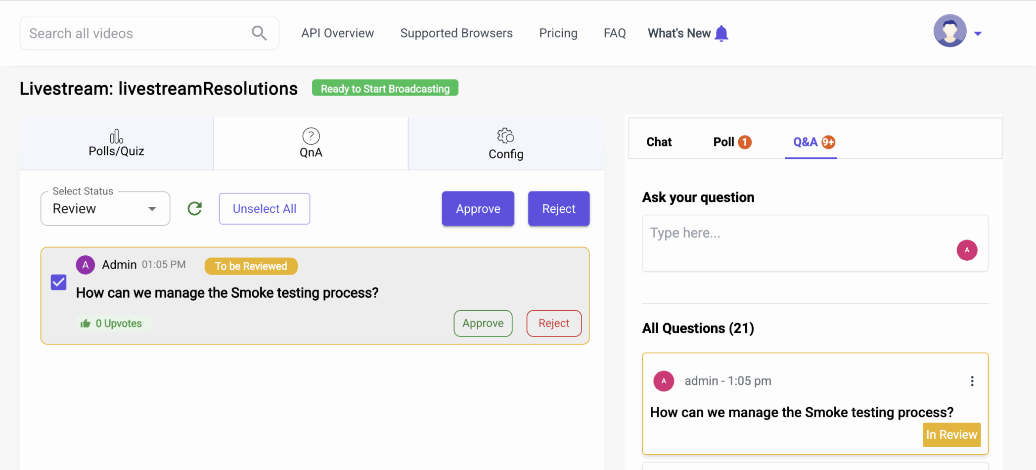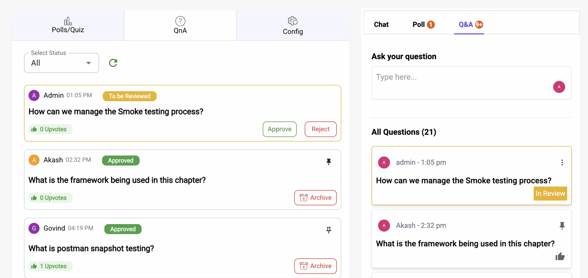 Moderators now have full control to manage question visibility. Every submitted question enters a review stage. After evaluating relevance, tone, and intent, moderators can Approve or Reject the question. Approved questions become part of the live chat or QnA panel for broader audience visibility. Rejected questions remain private and do not disrupt the engagement experience.